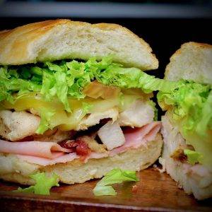 Tiras de pollo, cebolla roja en juliana, pimientos verde, rojo y amarillo a la plancha bañados en queso cheddar.