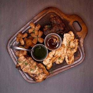 RD$6,200.00Fina selección de distintos cortes a la parrilla: Churrasco importado (12 Oz), chuleta de cerdo (12 Oz), pechuga de pollo (12 Oz), salchicha italiana, acompañados de nuestra salsa chimichurri y dos guarniciones de su elección.