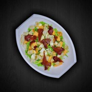 RD$630.00Hojas de lechuga romana, rúcula, trozos de melon, jamón serrano crocante, queso mozzarella, reducción de balsámico y lascas de pan crocante.