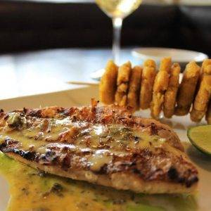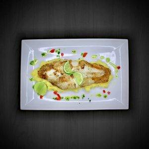 Exquisito filete pescado dorado, con dos opciones de salsa para su eleccción una salsa roja a base de tomates, pimientos rojos asados, cebolla blanca, perejil en aceite de oliva o salsa blanca a base de mantequilla, harina, leche, cebolla blanca, hojas de laurel, sal y pimienta.