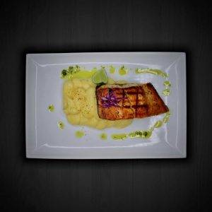 Delicioso de filete de salmón glaseado con salsa teriyaki acompañado de hongos, cebolla y brocoli salteado con puntos de mayo sriracha.