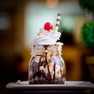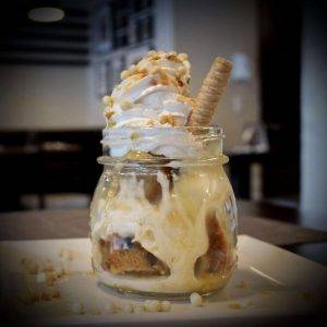 Pedacitos de galletas de Chocolate Chips trituradas, helado de vainilla, crocantes de chocolate blanco francés, nueces, nutella, decorado con un “Palito de Zebra”.