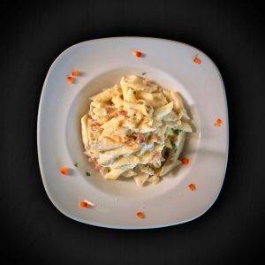 Linguini o penne en salsa bechamel con trozos de pollo, crocante de tocineta y lascas de parmesano acompañado de rodajas de pan y grillado en aceite verde y ajo.