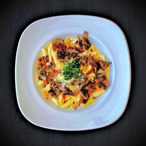Penne o linguini a base de hongos salteados, bacon, queso parmesano, aceite de trufas y crema blanca.